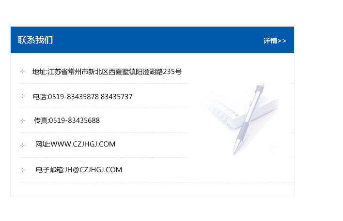 地址:常州市新北區友邦商務大廈1幢16、17層  電話:0519-85101652  傳真:0519-85112595  郵編:213022  網址:www_cz-jiayue_cn.hbyidehuibao.com  郵箱:xiajifengaa@163.com